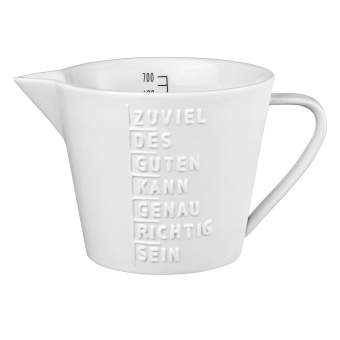 • Die Messbecher aus Porzellan eignen sich ideal für den häuslichen Gebrauch zur ungefähren Bestimmung von Flüssigkeits- oder Trockenmengen. Bitte beachten Sie, dass die Skala im Inneren des Messbechers aufgrund der handwerklichen Herstellung leicht variieren kann. Die Skala dient daher nur der Orientierung und ist nicht für präzise Messungen ausgelegt.
