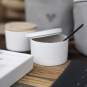 - Die Dosen und Kännchen sind nicht spülmaschinengeeignet, insbesondere wenn sie Veredelungen wie Drucke oder Aufdrucke aufweisen. Für eine lange Haltbarkeit empfehlen wir die Reinigung von Hand mit mildem Reinigungsmittel und einem weichen Tuch oder Schwamm, um Farbabrieb und Beschädigung der Oberfläche zu vermeiden.